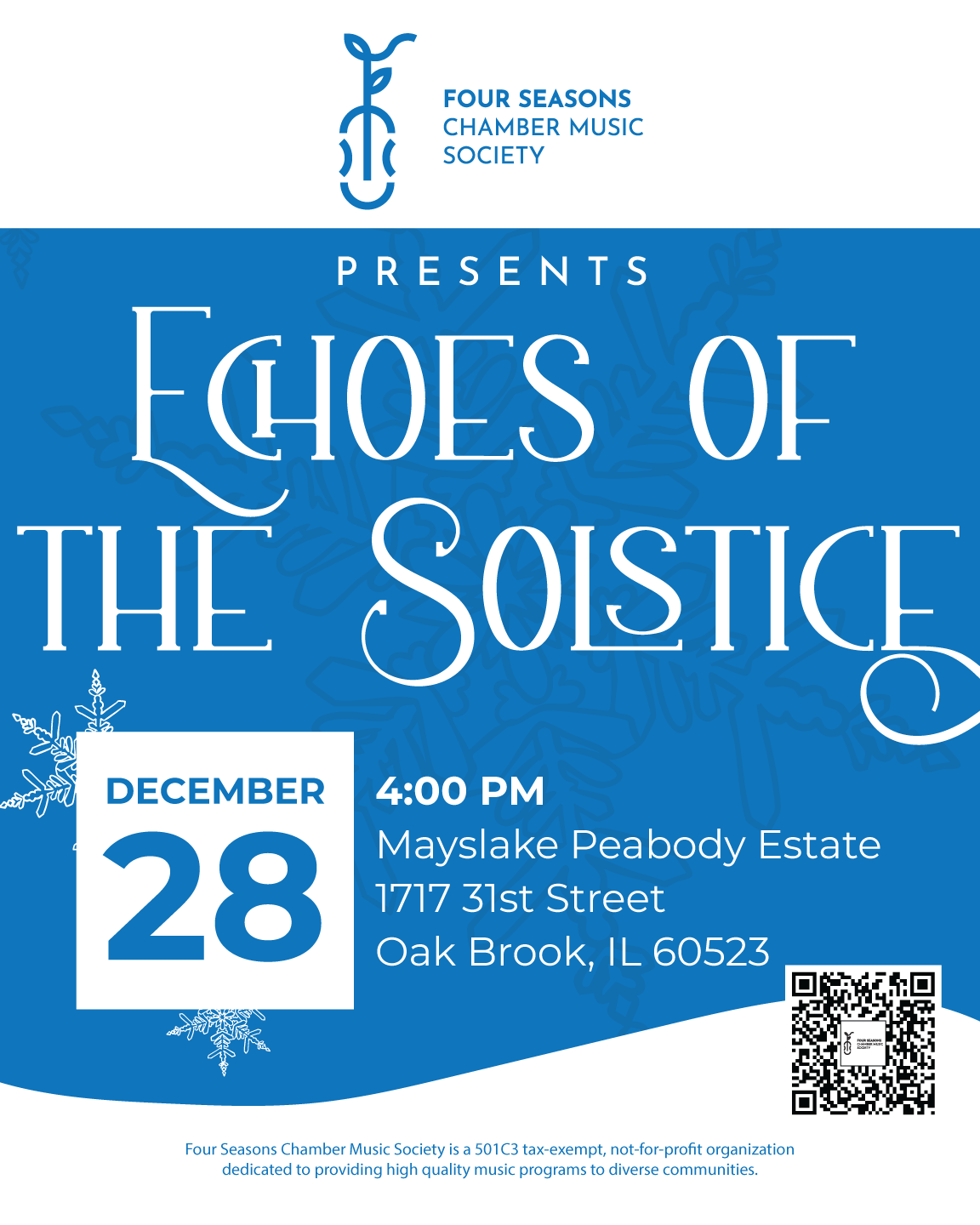On December 28th, we invite you to an evening of wintry chamber music, arriving just after this year’s Winter Solstice. Classics like Corelli’s Christmas Concerto, Schubert’s Winterreise, and Vivaldi’s Winter from The Four Seasons are a few of the many enduring pieces that blend seamlessly with more contemporary holiday works. The program promises an evening filled with cheer, warmth, and celebration of the season.